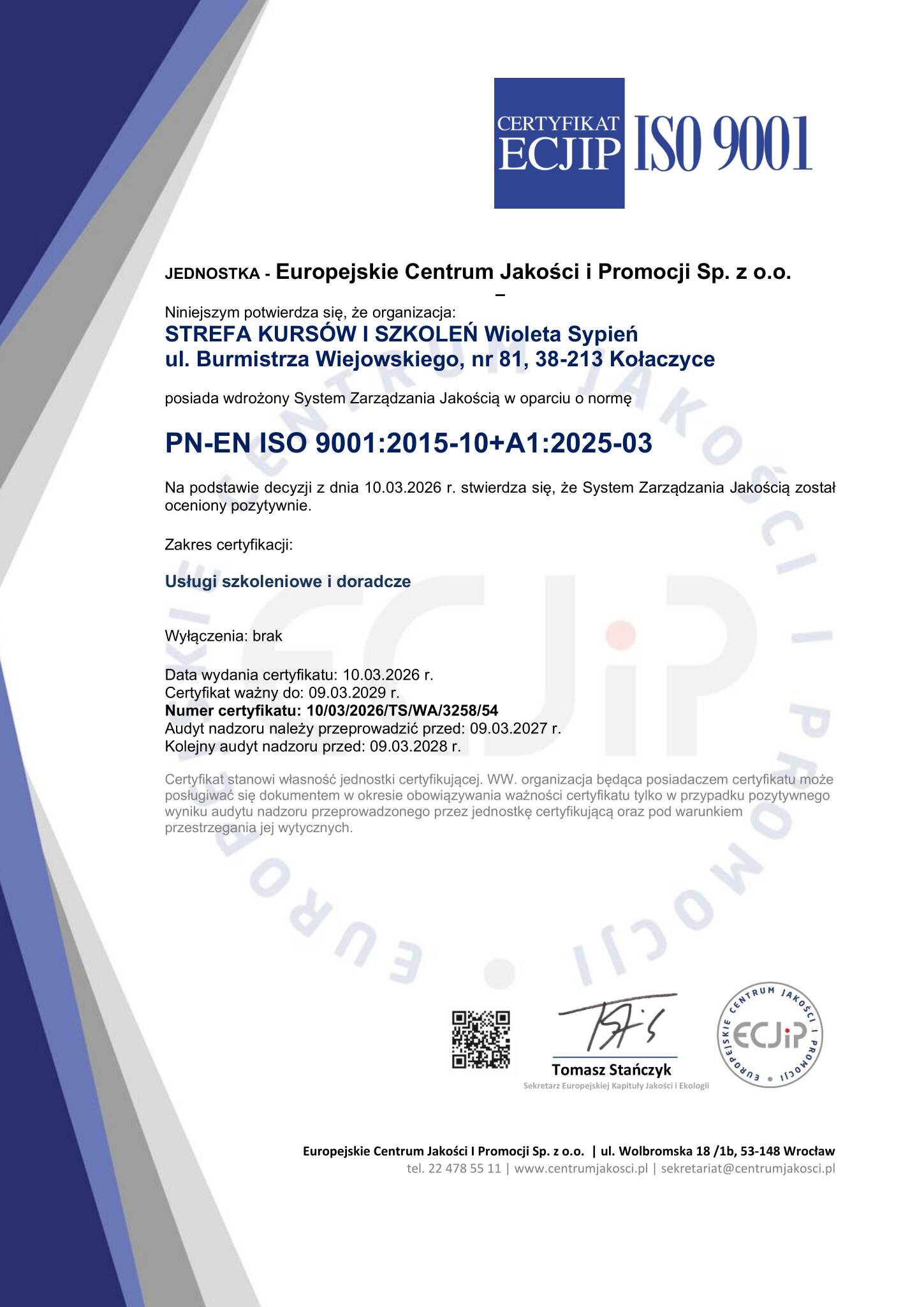 Posiadamy certyfikat Systemu Zarządzania Jakością (PN-EN ISO 9001:2015), co gwarantuje stałą, najwyższą jakość naszych usług.